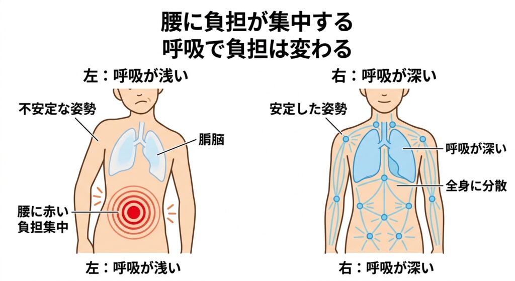 👉 ストレッチやマッサージをしても腰痛が改善しない方の中には、「呼吸の浅さ」が関係しているケースがあります